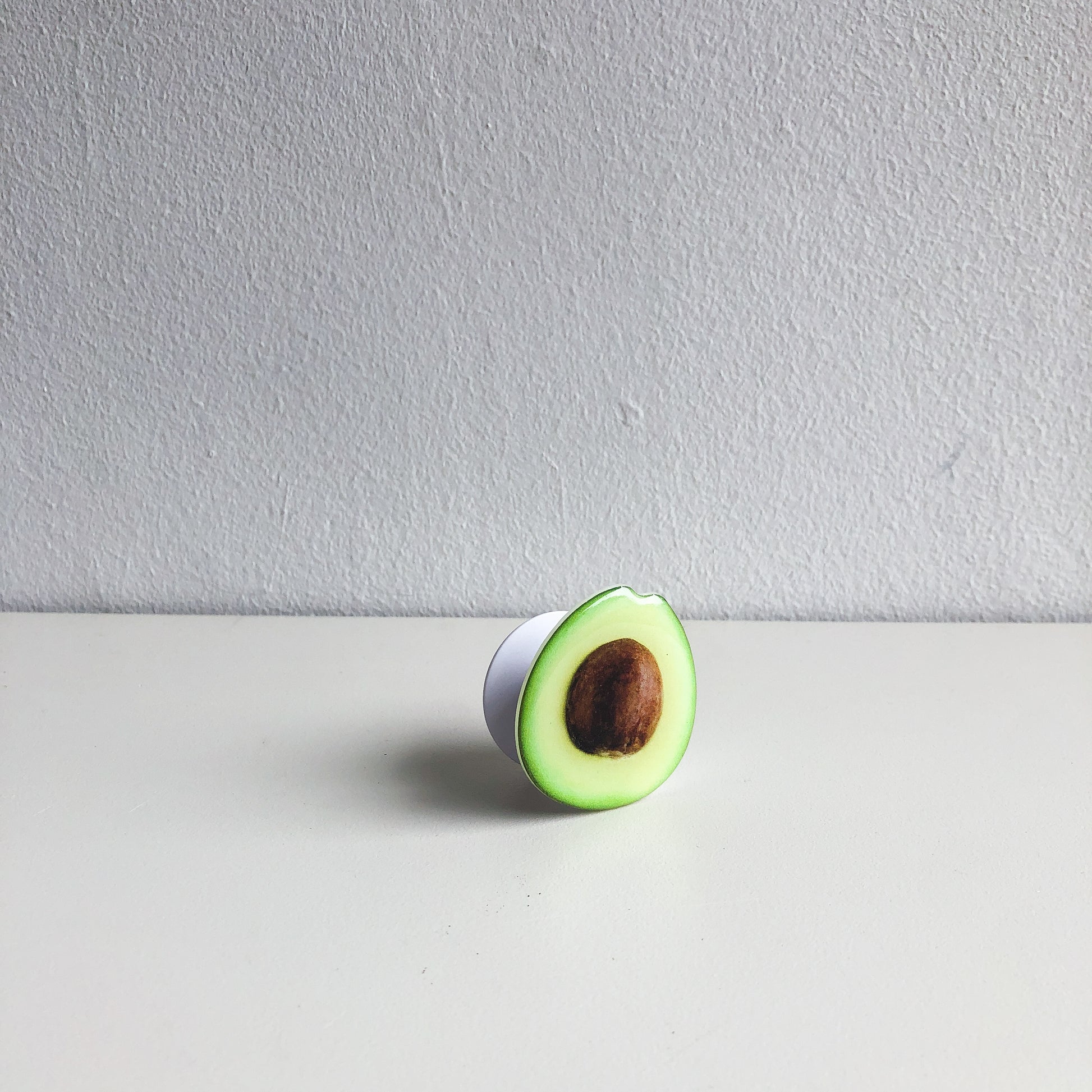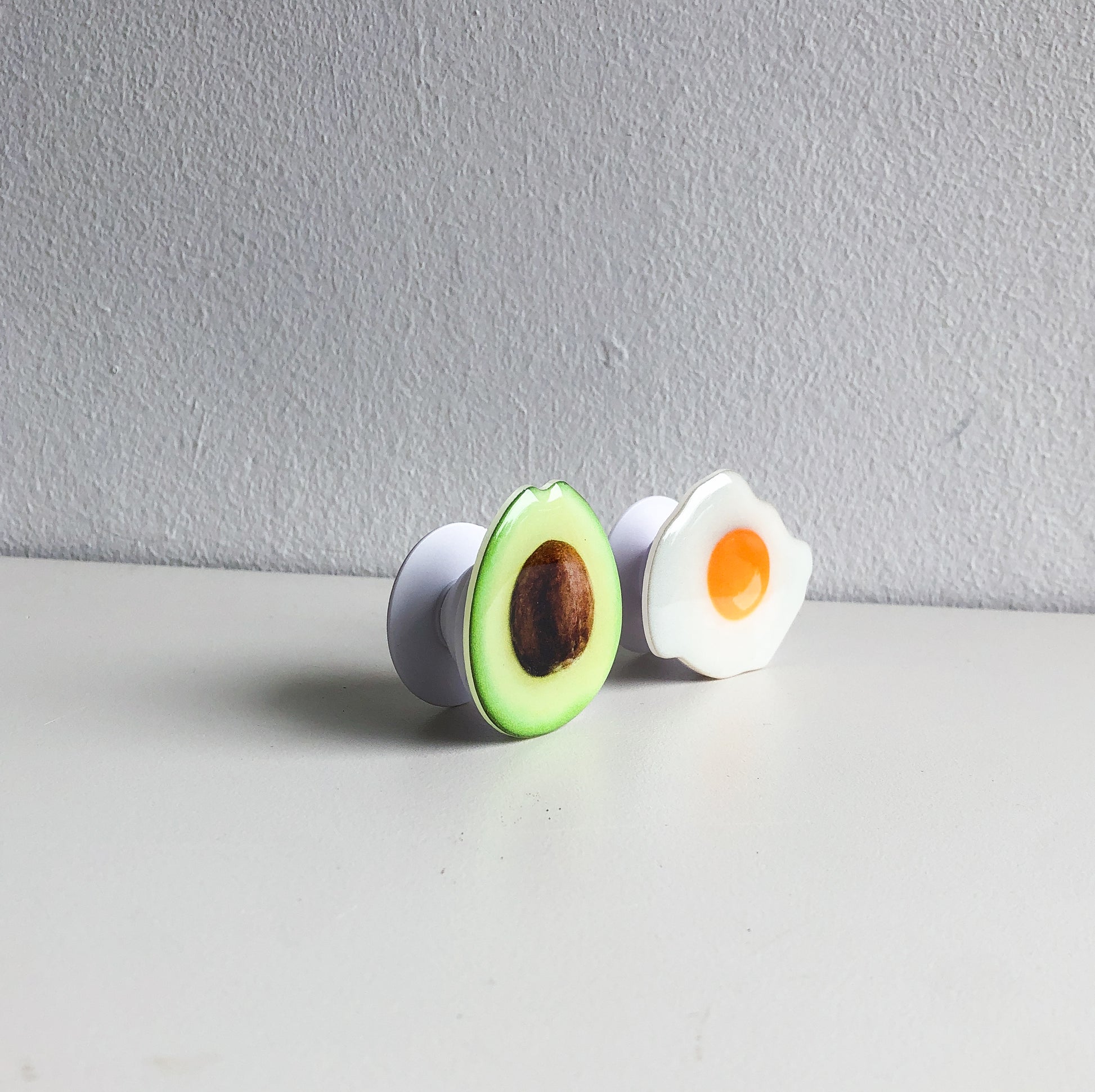 The Breakfast Set Pop Socket comes with a beautifully printed resin sunny side up egg or avocado half with heavy duty 3M adhesive backing for longevity.