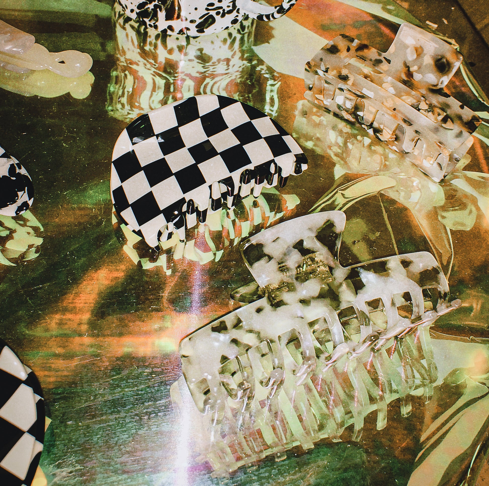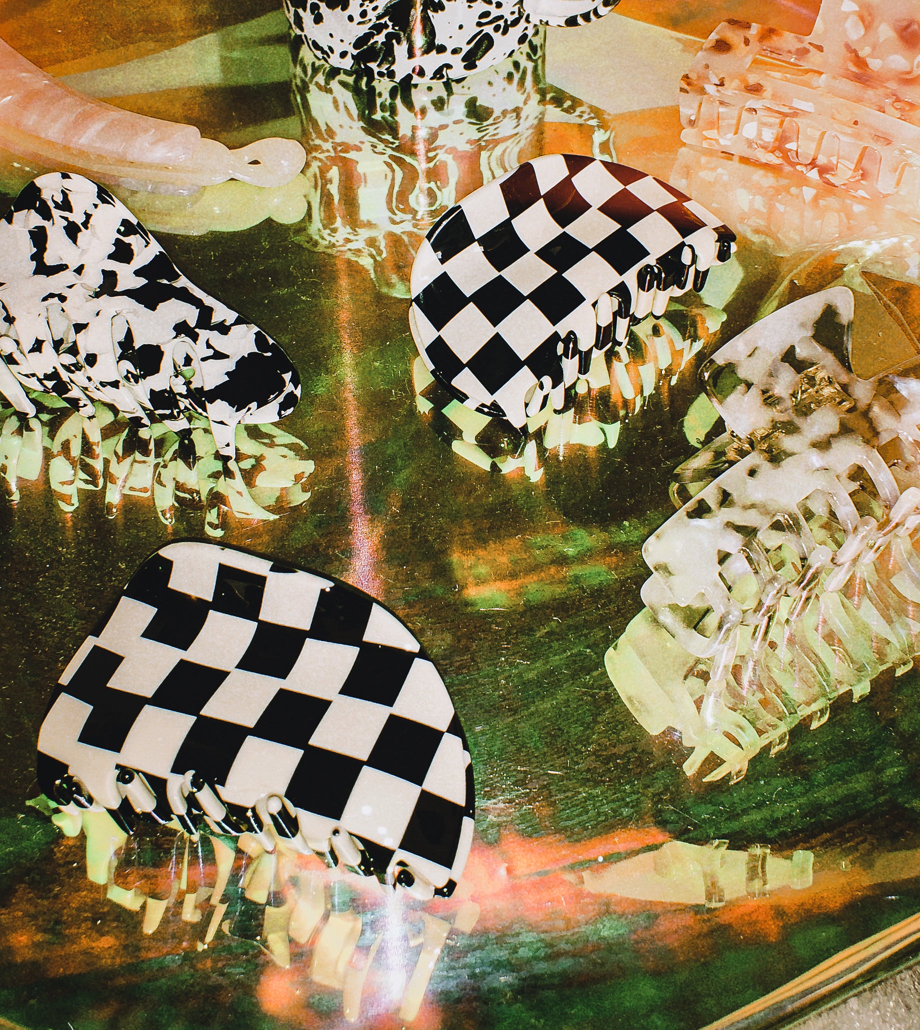 The Chessboard Hair Claw is a bold black & white checkered hair claw measuring 8cm by 4.5cm. Available in Black, Brown, Purple, Pink, Green or Blue checkers.