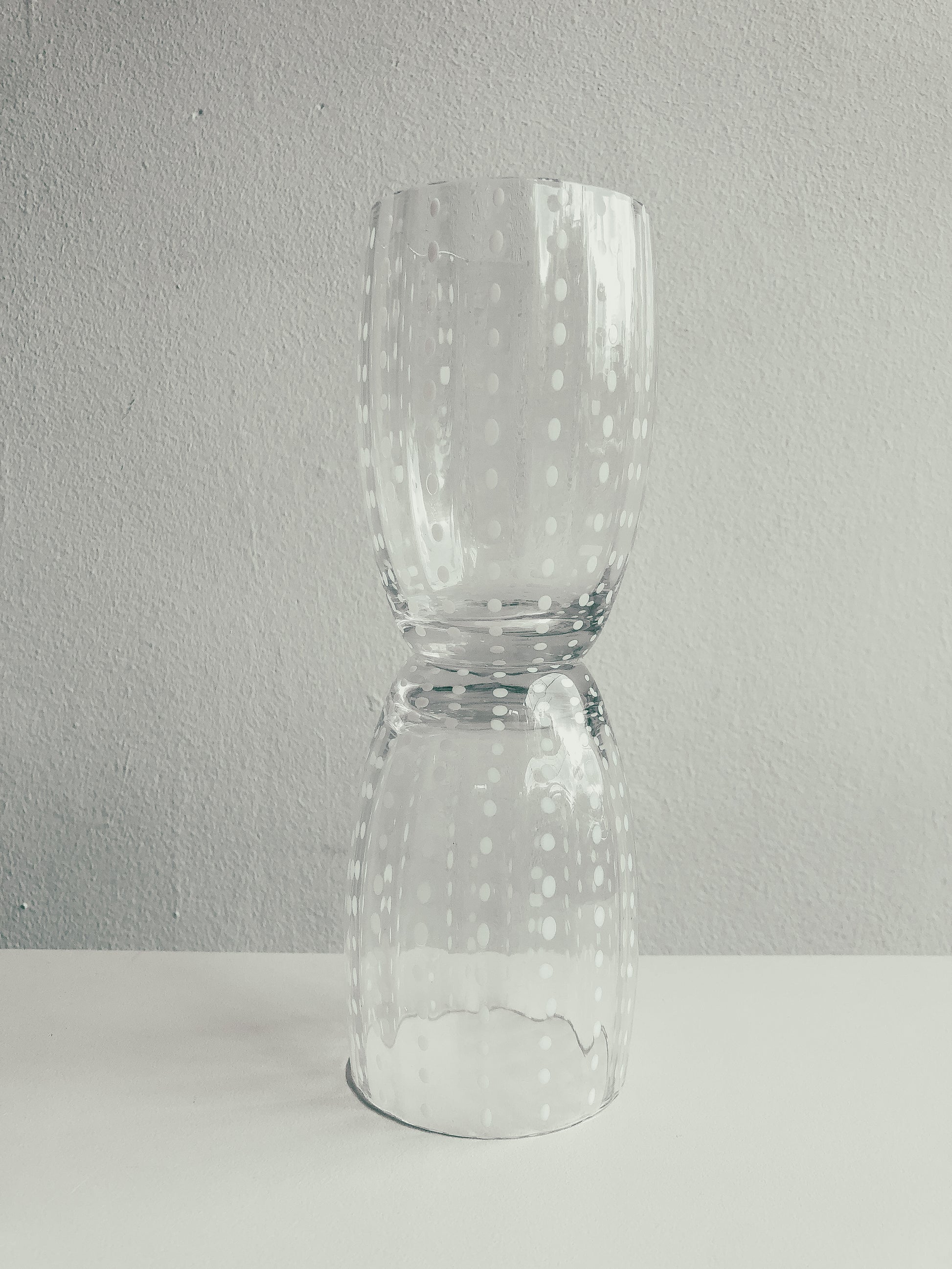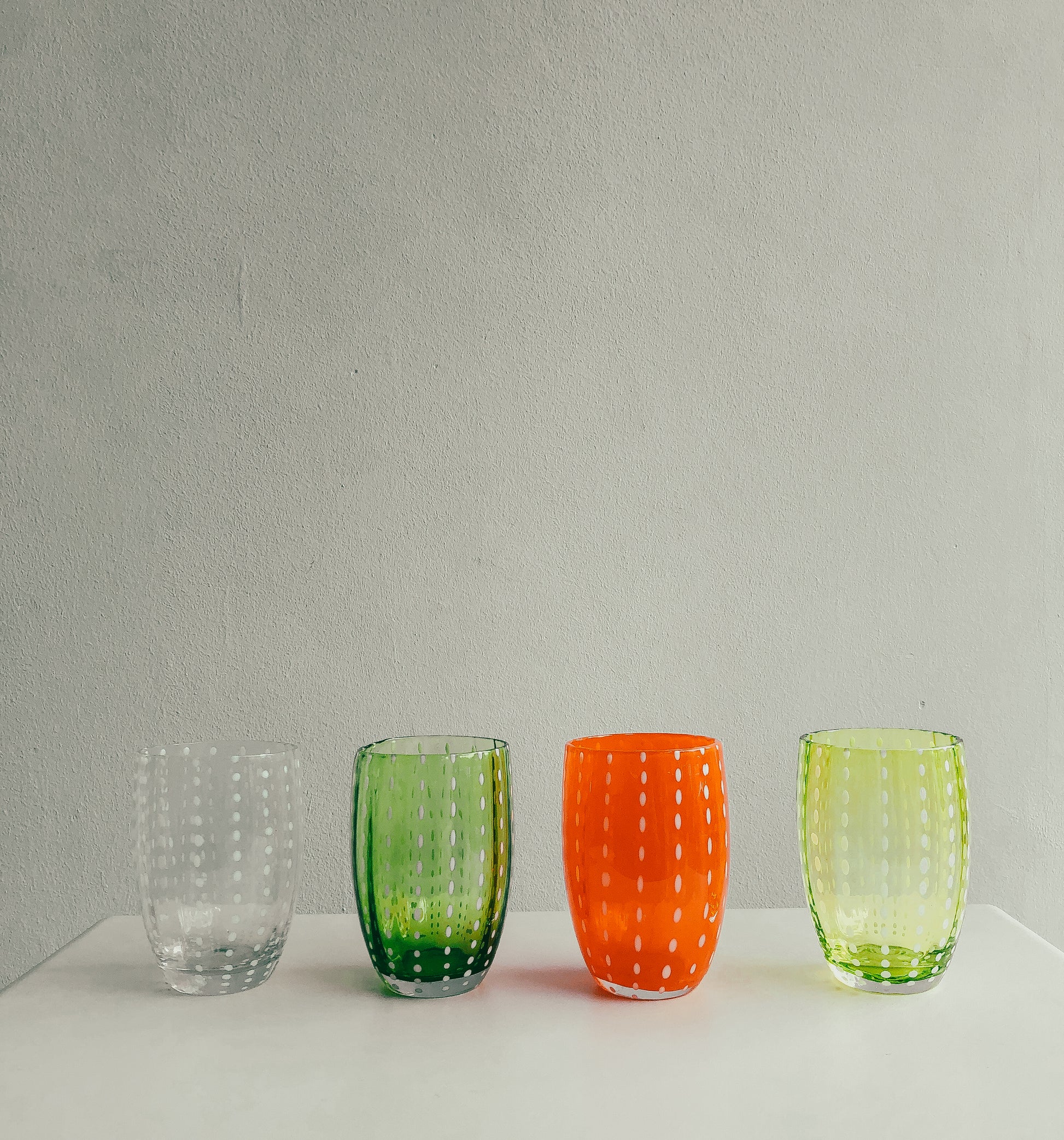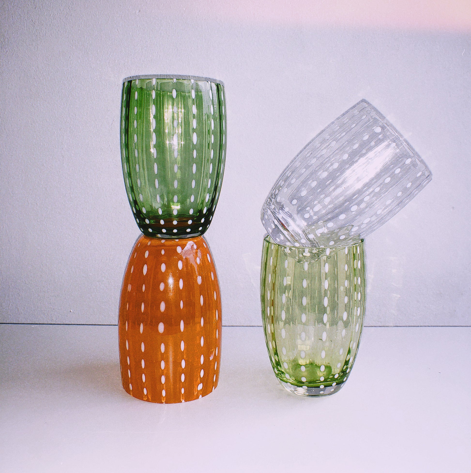 A beautifully handcrafted series of Mexican Glassware with white speckled dots. Available in several stained glass variations: Clear, Dark Green (Empoli), Light Green (Lime), and a bright orangey red (Chilli) individually or as a set of 2.
