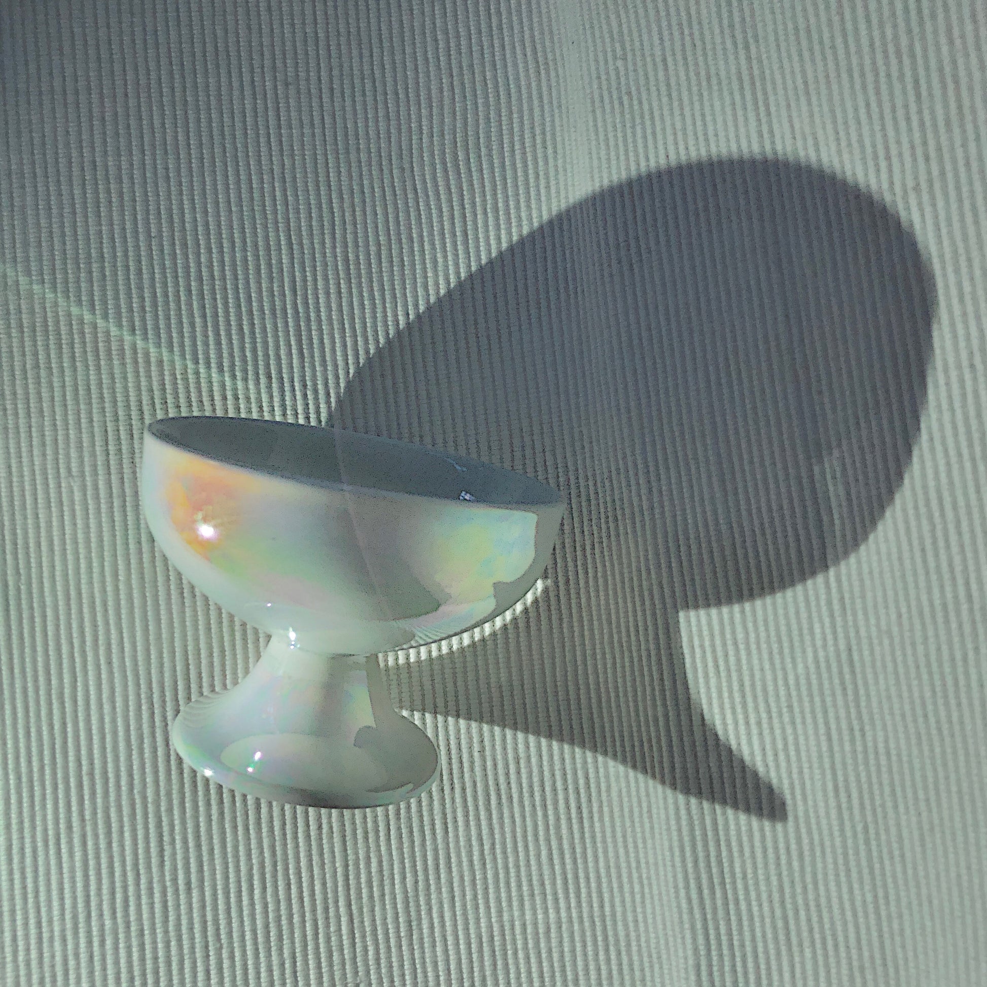 This is a handmade ceramic ice cream bowl in the shape of a chalice. The holographic coating adds a touch of playfulness to your table setting either as a stand-alone item or together with other pieces of the PROSE.