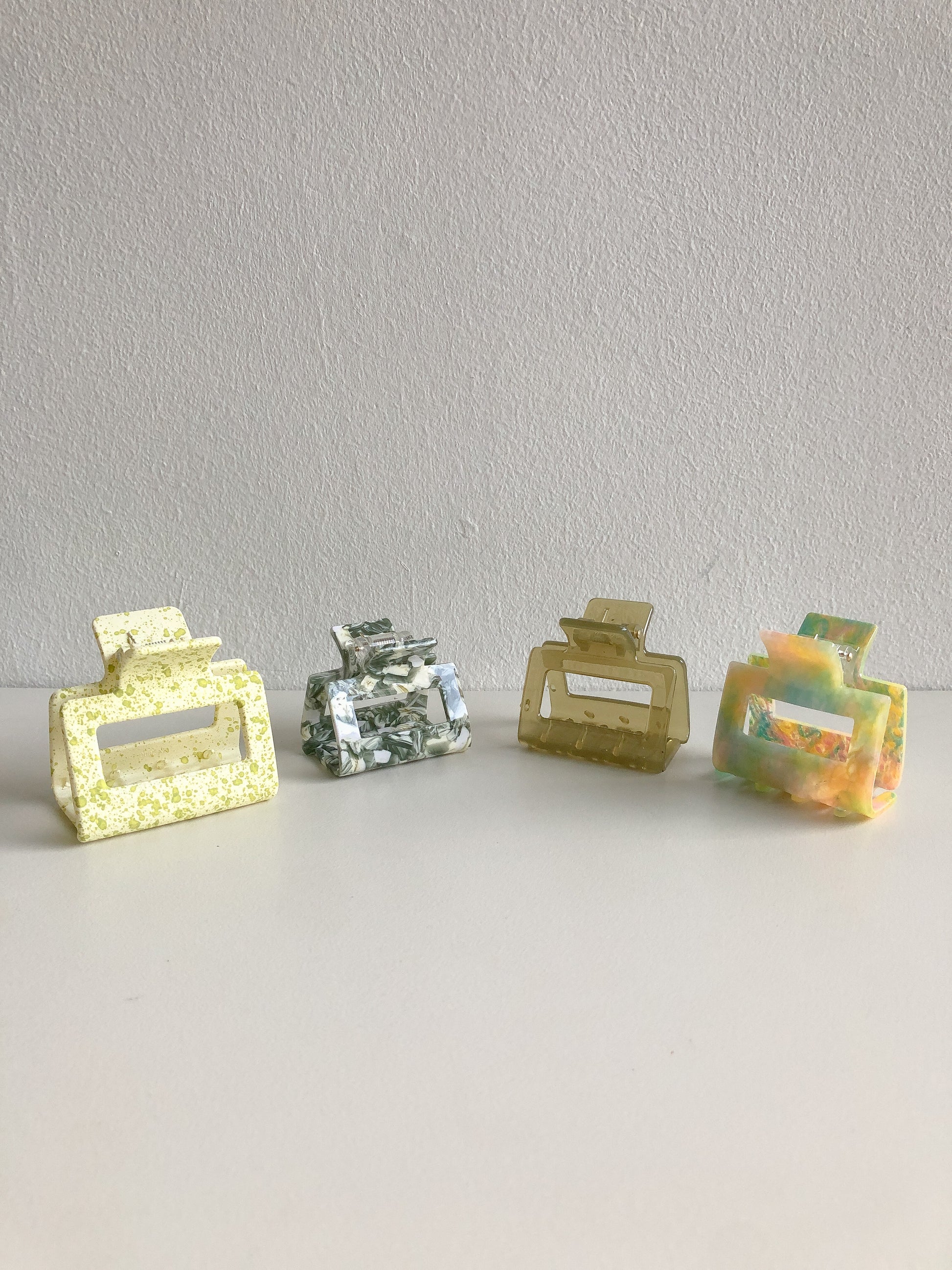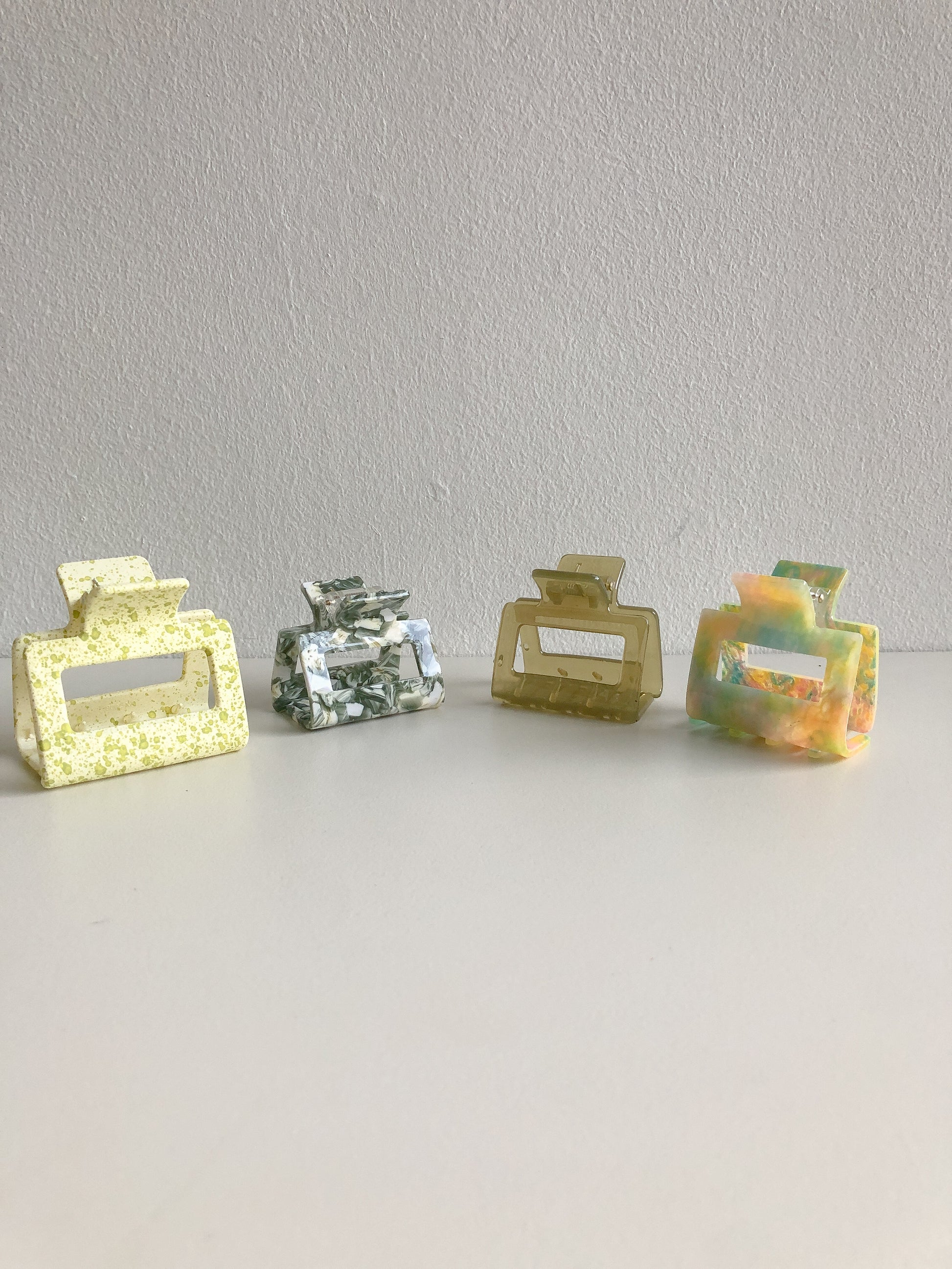 A matte finish claw clip in lemon yellow and lime paint splatters. This claw clip measures approximately 5 cm across.