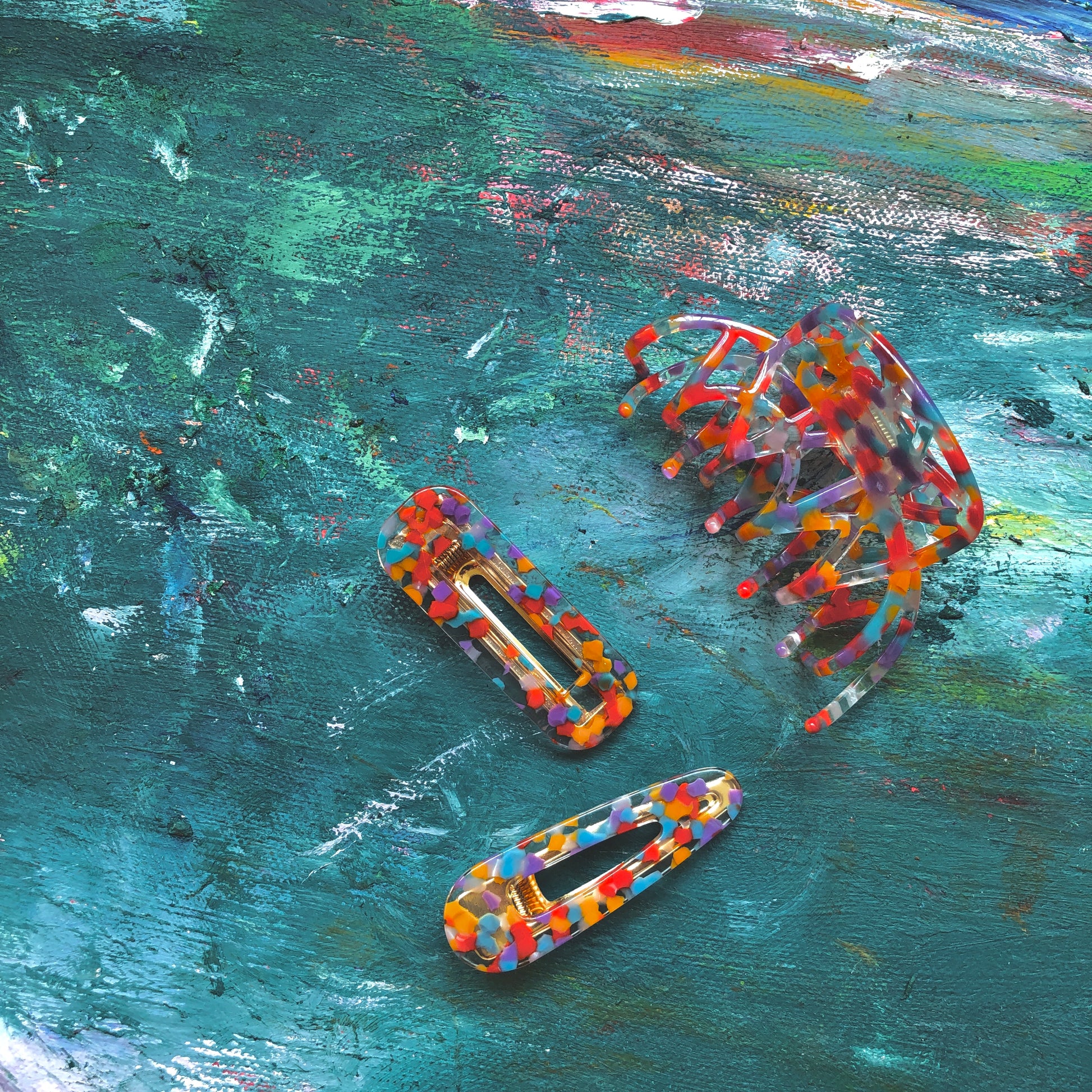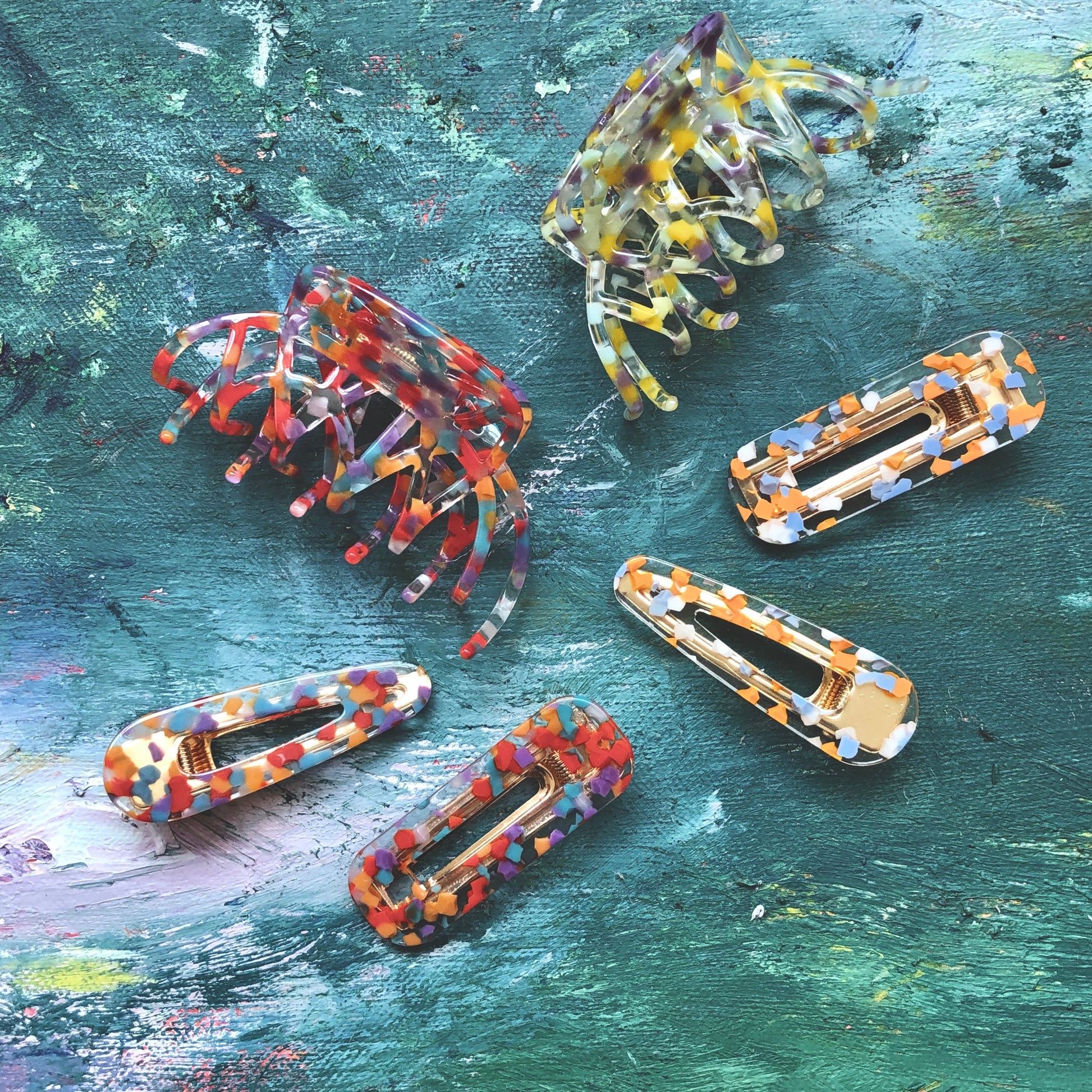 Styles available: Clear resin Hair Barrettes and Hair Claws speckled with dots of paint.