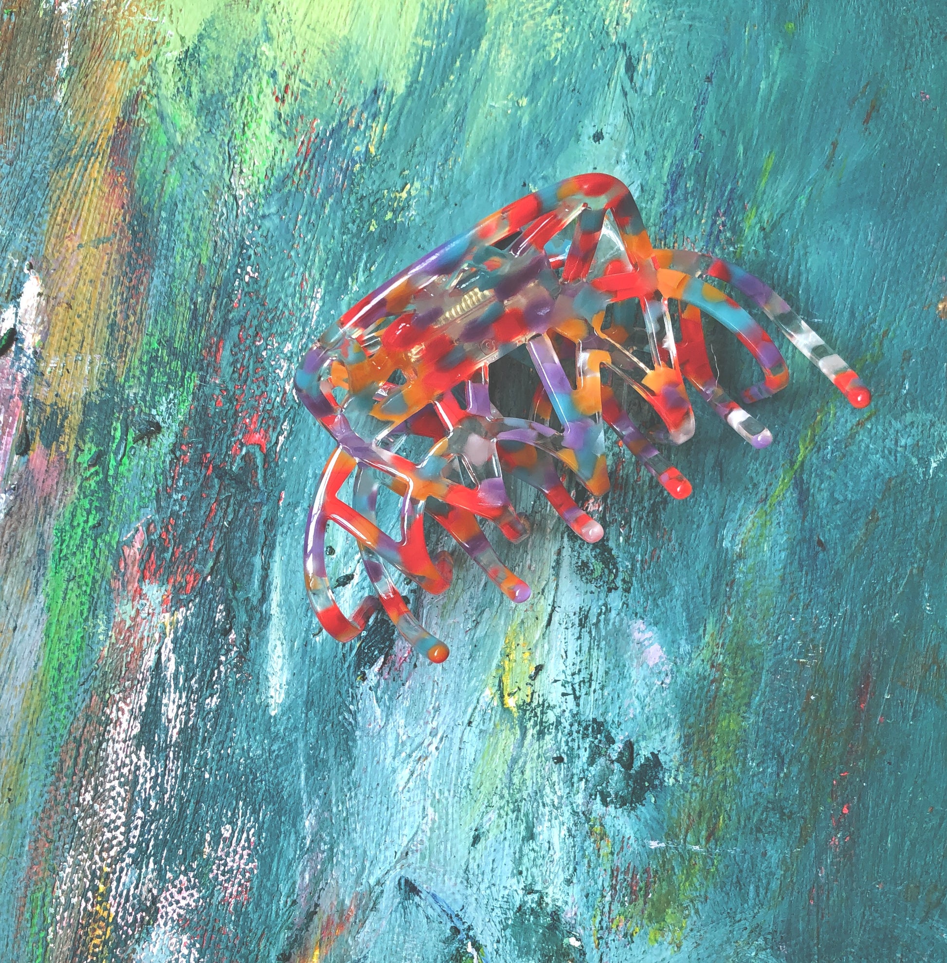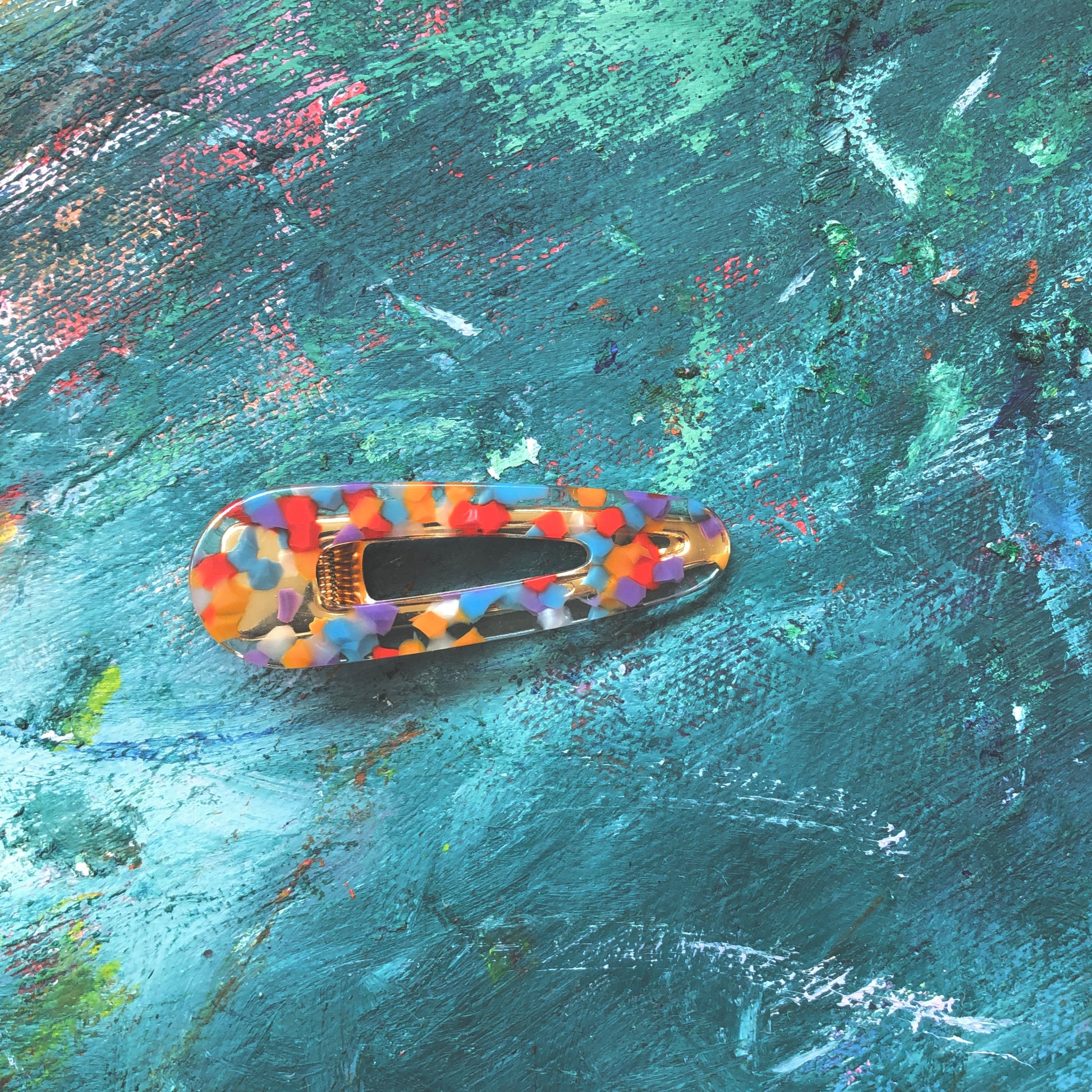 Hand-poured resin clips speckled with paint dots the colour of the sky.