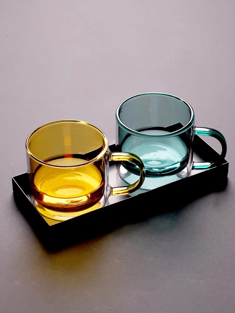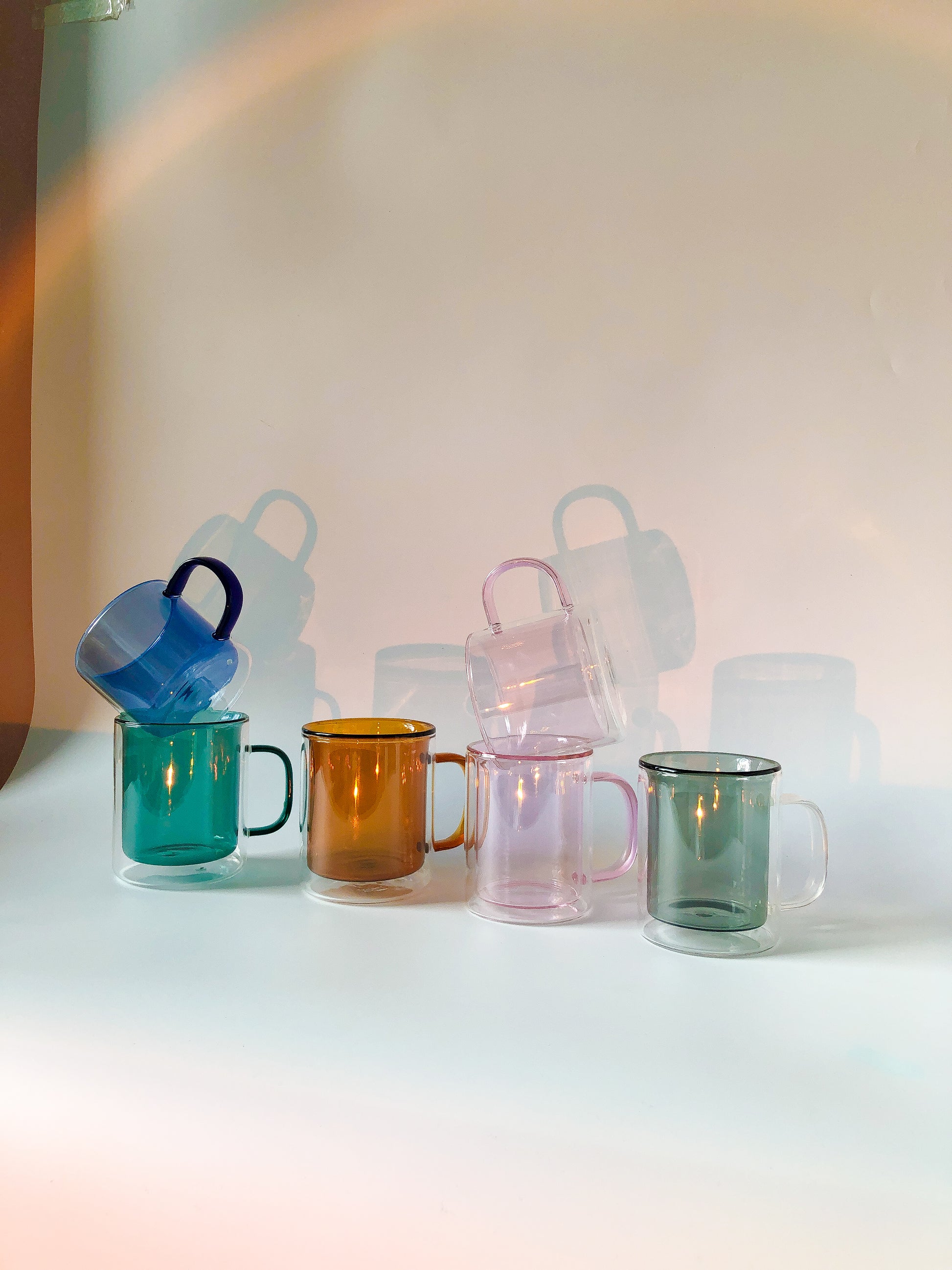 Handblown double-walled coffee mug available in blue and pink.