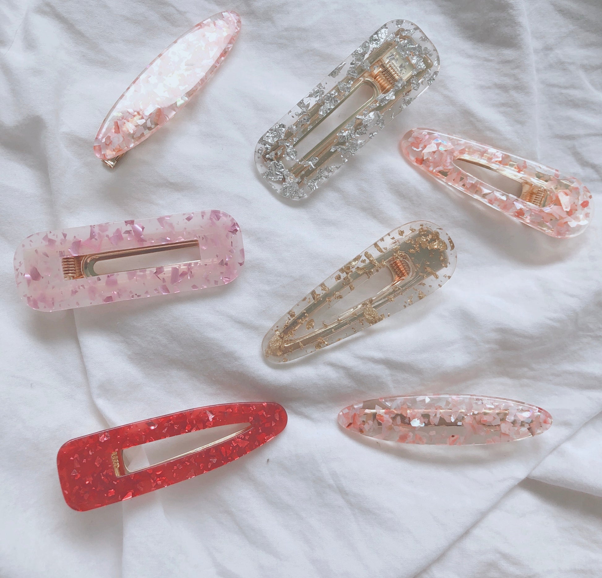 - Terrazzo Bundle: 2 Coral Shell Almond Hair Barrettes, 1 Tapered Coral Shell Hair Barrette, 1 Silver Rectangular Barrette, 1 Gold Tapered Barrette, 1 Red Tapered Barrette, 1 Pink Rectangular Barrette.