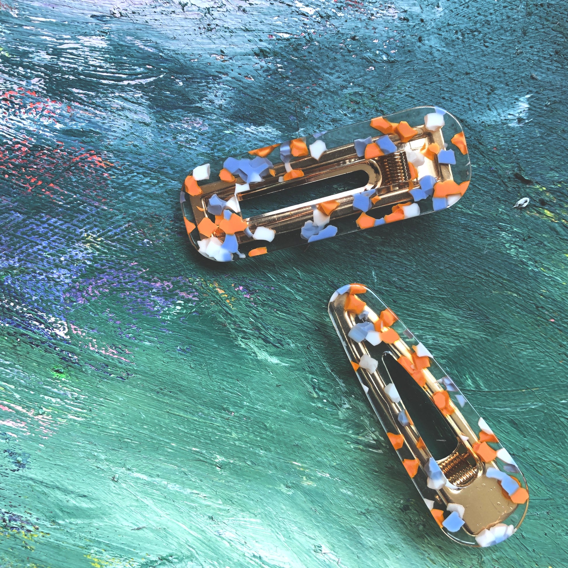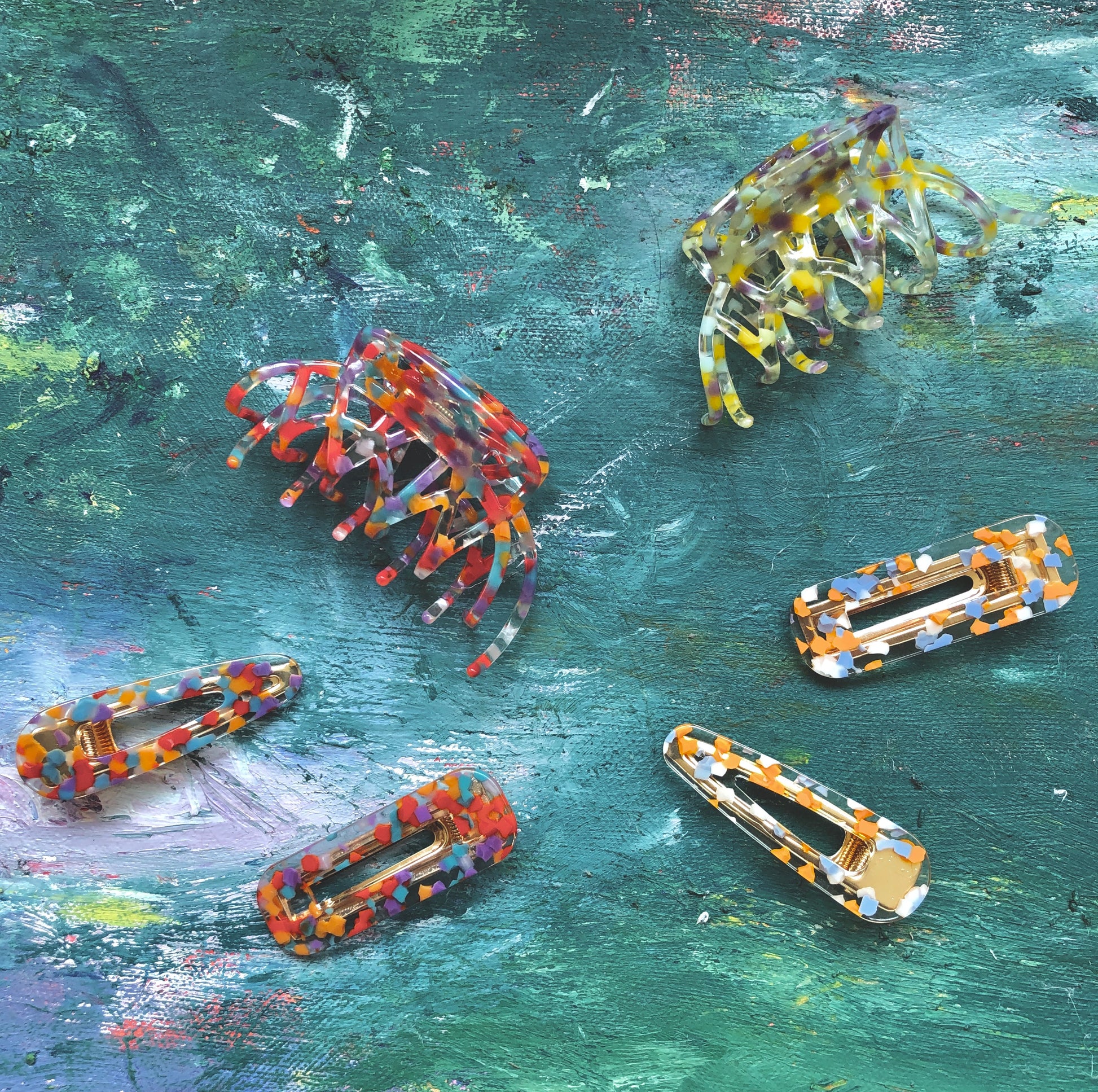 Styles available: Clear resin Hair Barrettes and Hair Claws speckled with dots of paint.