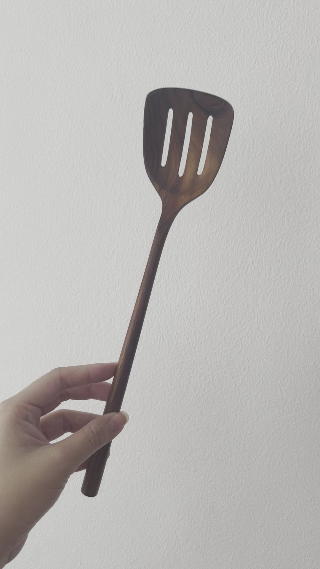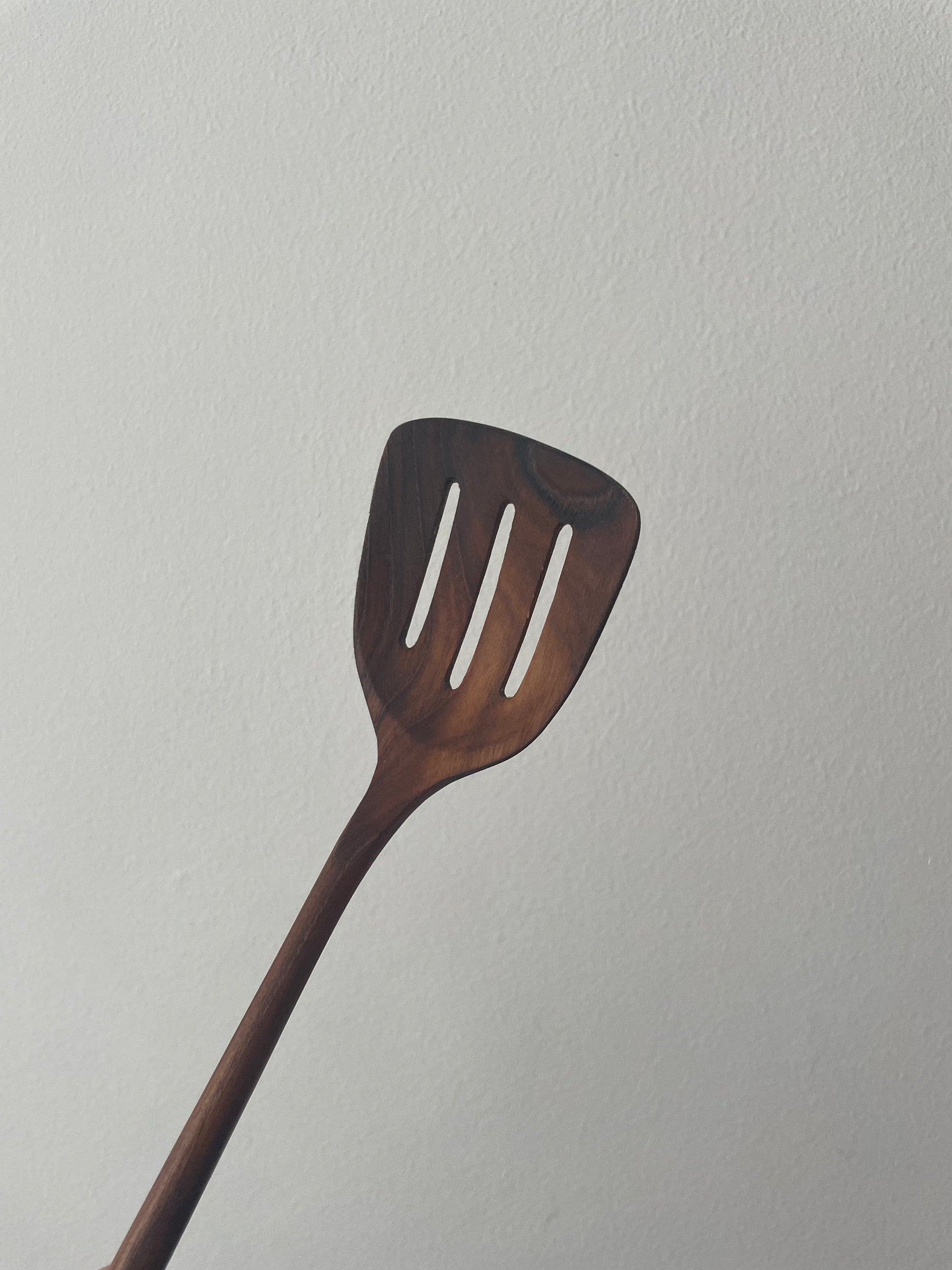 A beautiful raw wood spatula with natural grain and smooth lined silhouette. Measures approximately 30 cm long. great for slight pan frying and mixing of salad.